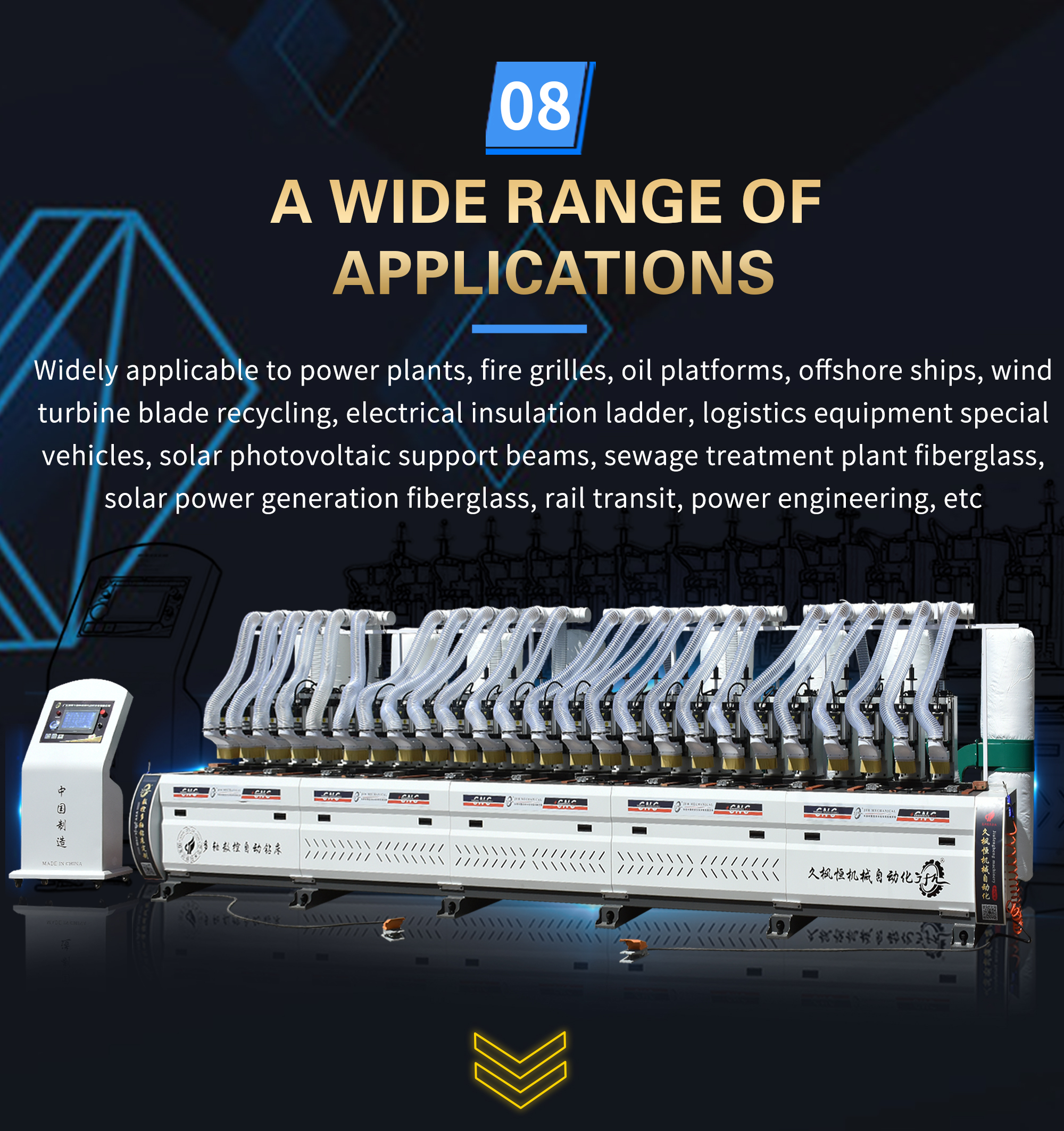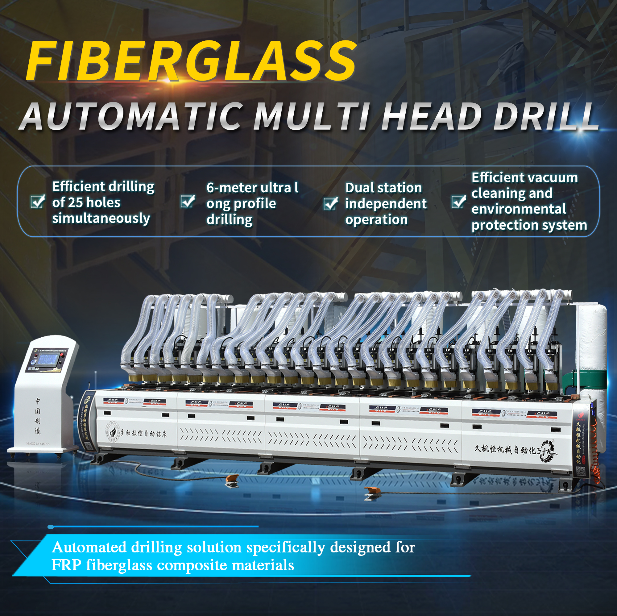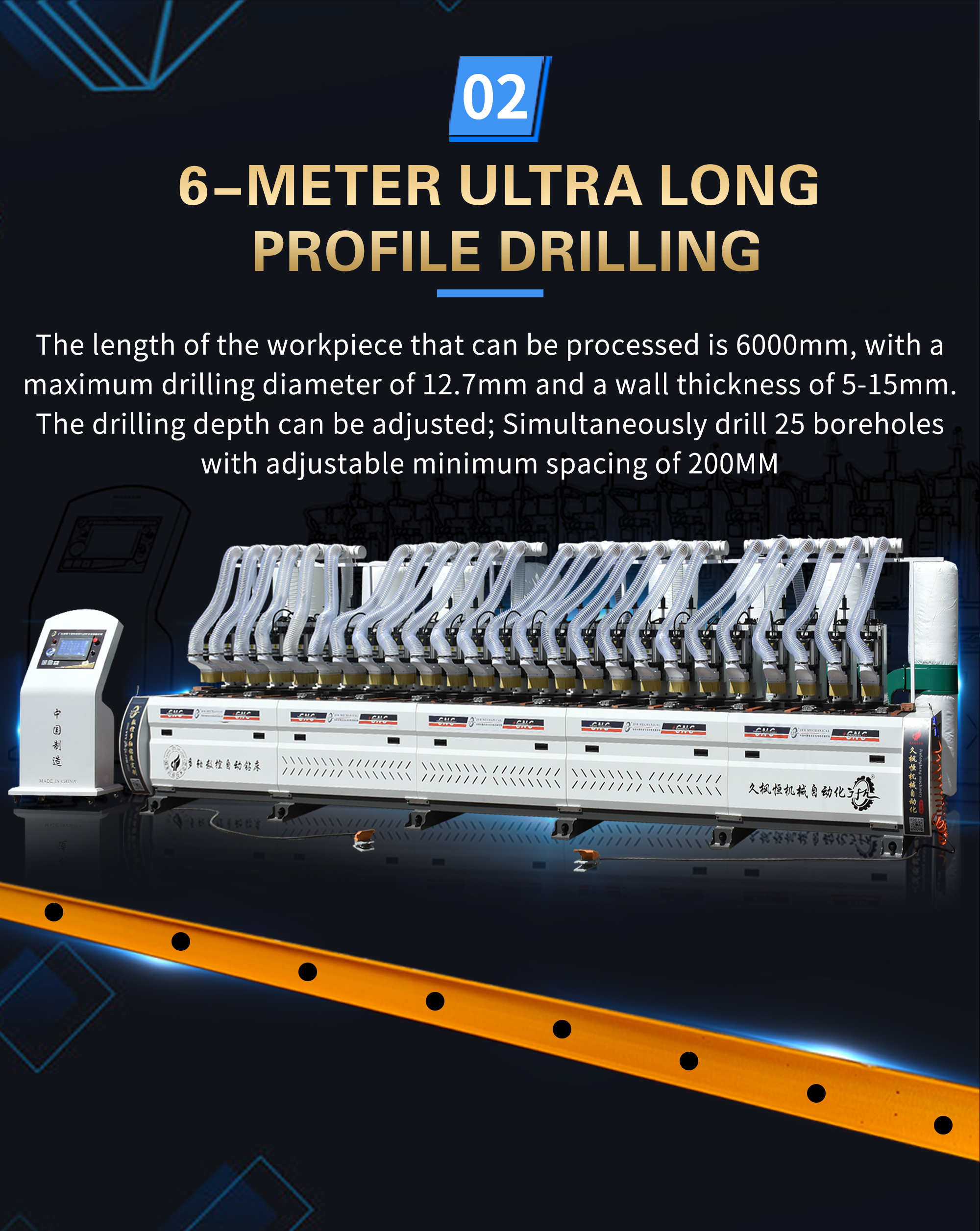 This machine is specially designed and manufactured for drilling marine glass fiber reinforced plastic grating. The whole machine has a vertical structure and is equipped with 19 sets of drilling power heads and 38 spindles. The length of the processable workpiece is 5800MM, the diameter of the drilling hole is 8.5MM, the wall thickness is 5-15MM, the drilling depth is adjustable, the artificial intelligence interface is used to control the rotation of the drilling power head, 38 drilling holes