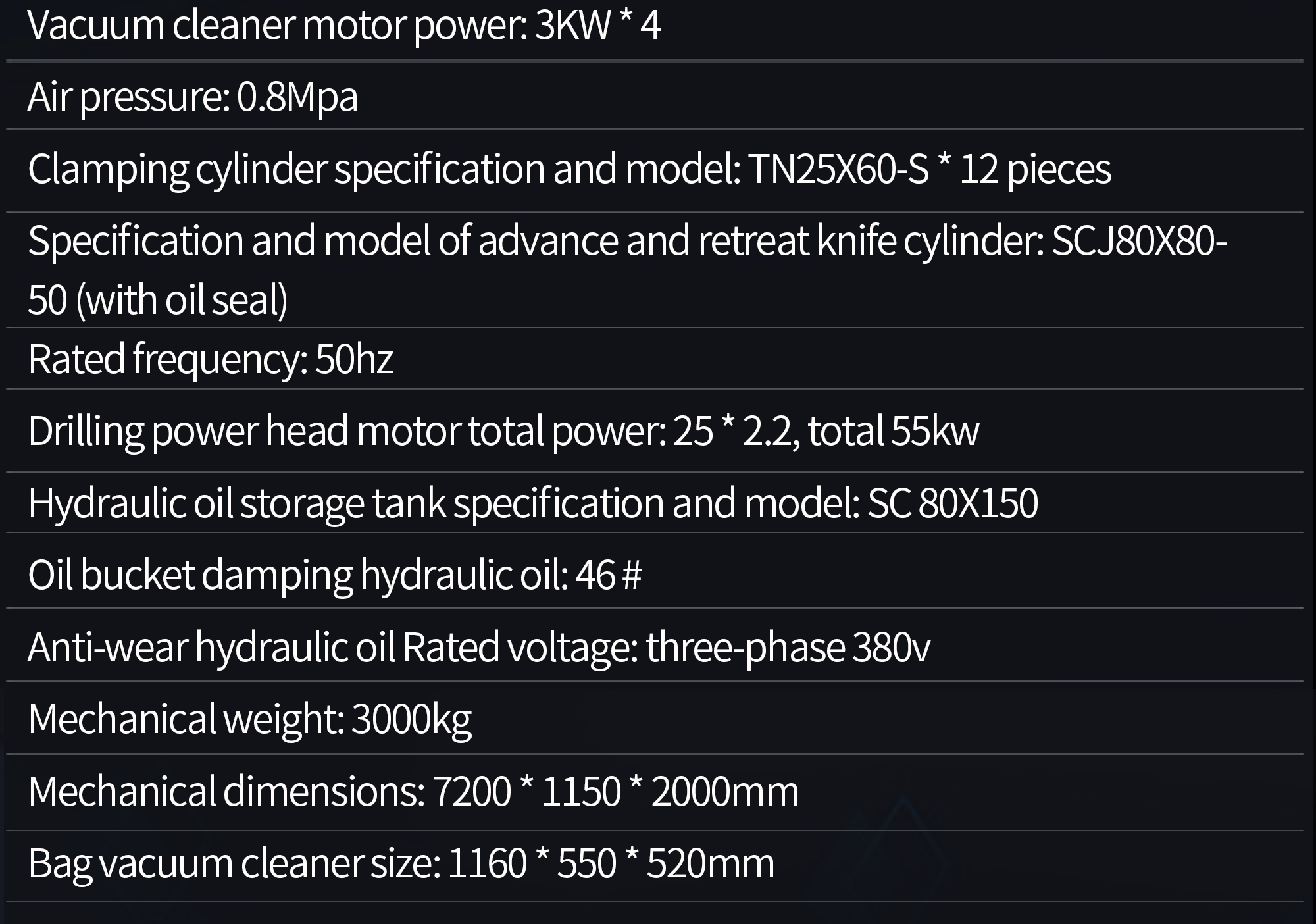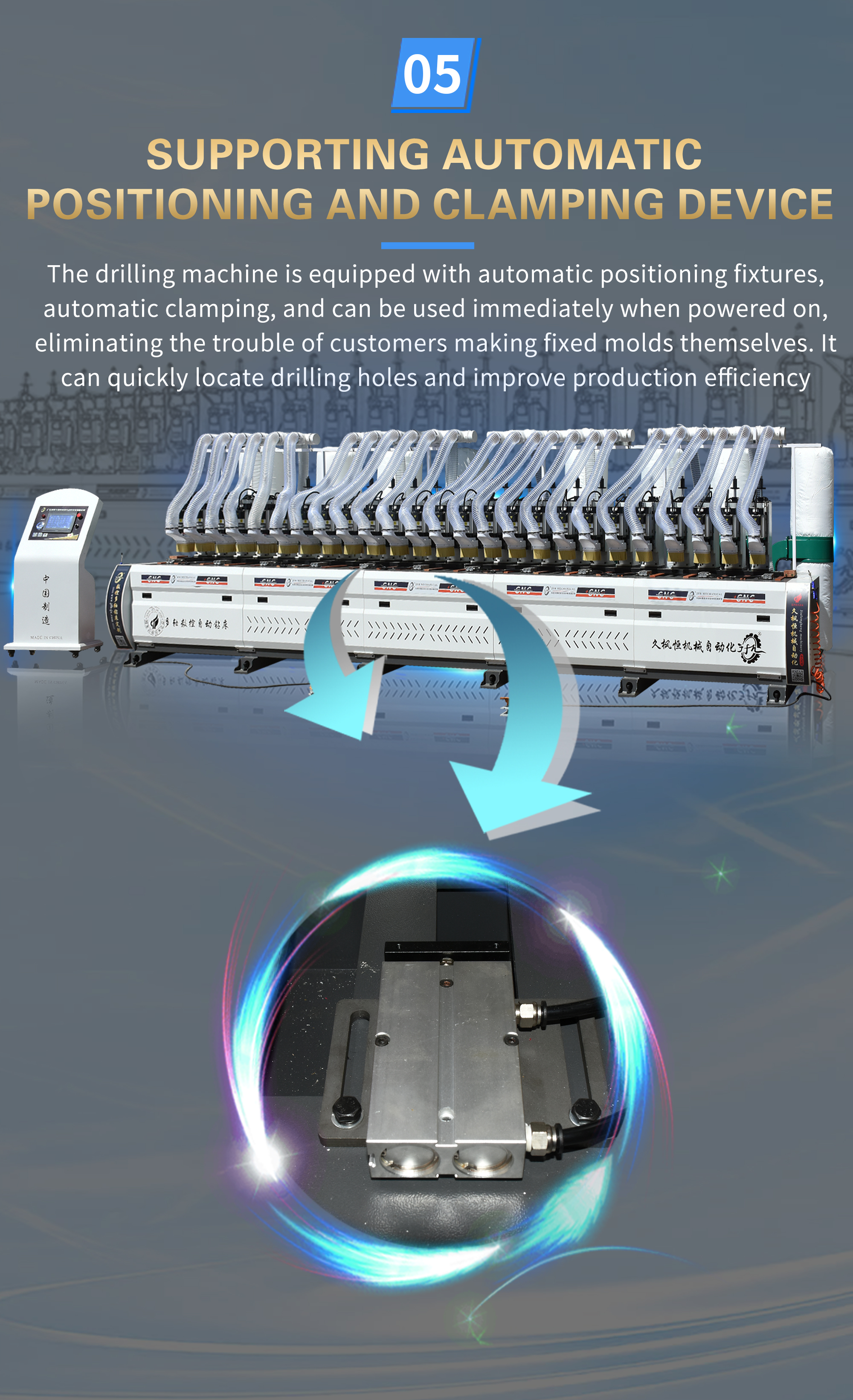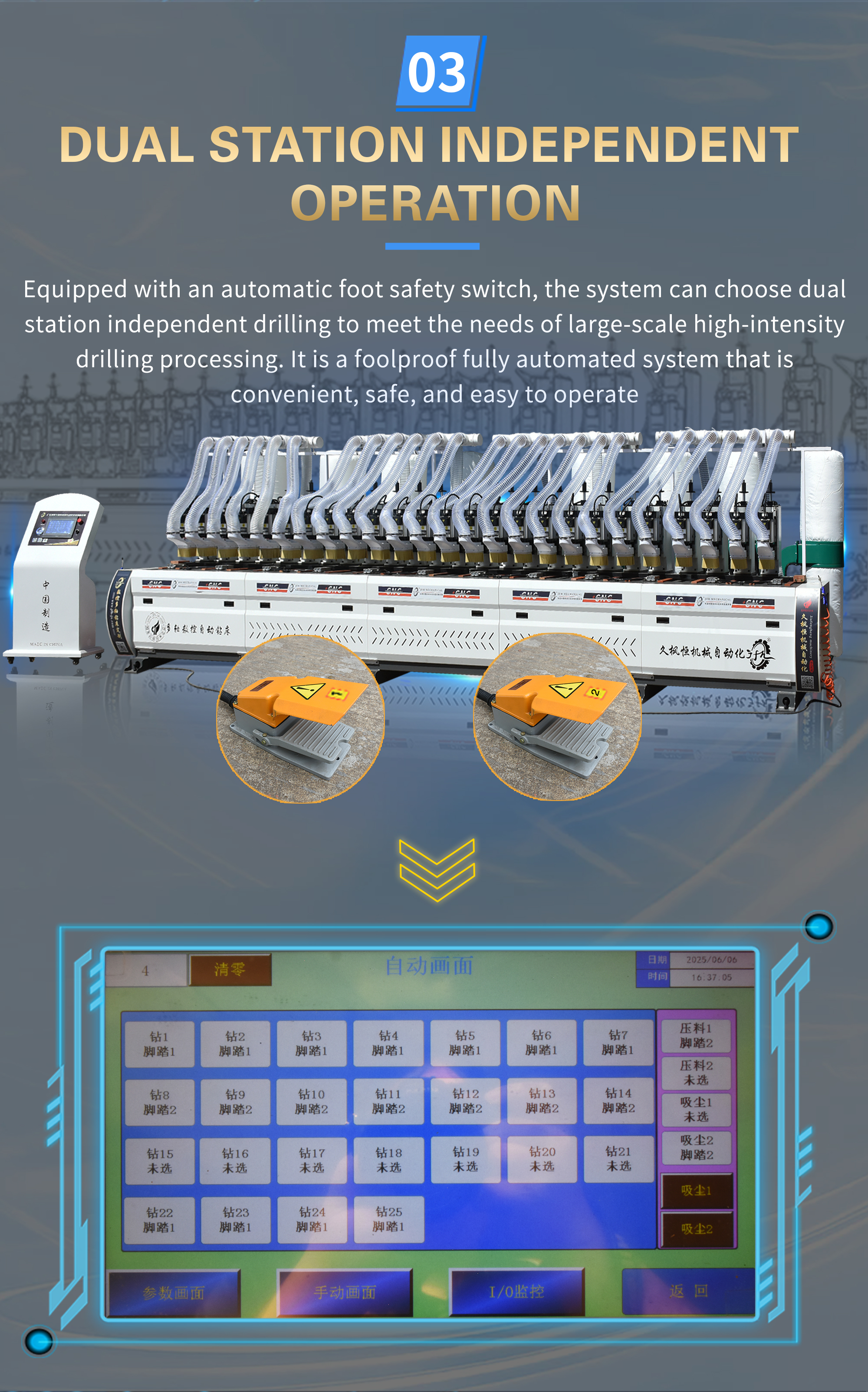 This machine is specially designed and manufactured for drilling marine glass fiber reinforced plastic grating. The whole machine has a vertical structure and is equipped with 19 sets of drilling power heads and 38 spindles. The length of the processable workpiece is 5800MM, the diameter of the drilling hole is 8.5MM, the wall thickness is 5-15MM, the drilling depth is adjustable, the artificial intelligence interface is used to control the rotation of the drilling power head, 38 drilling holes