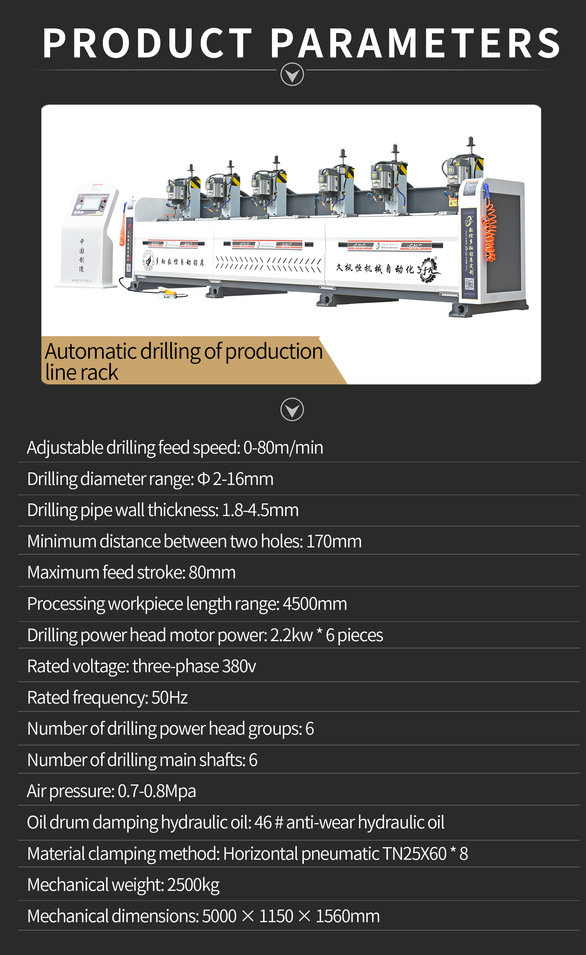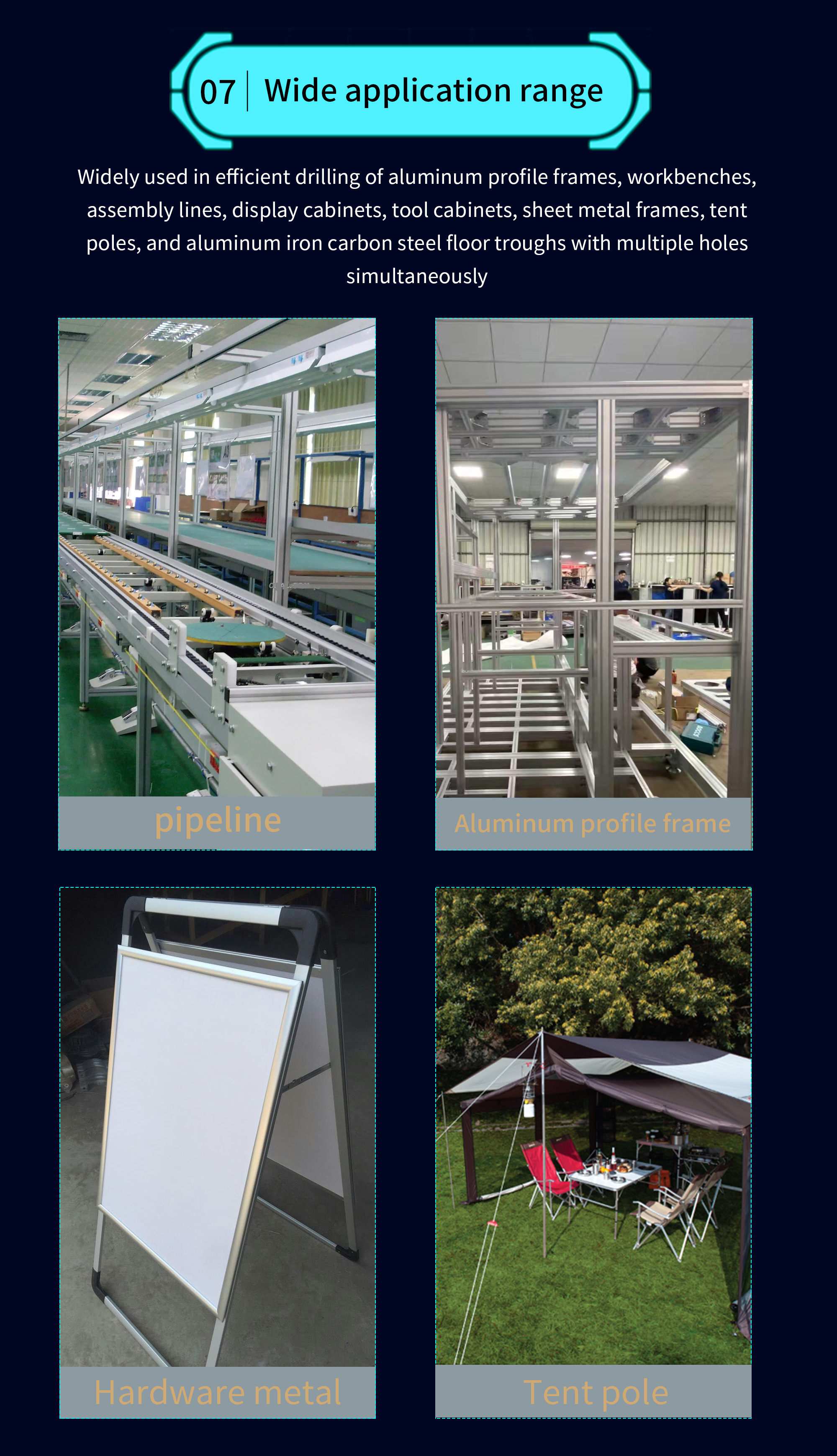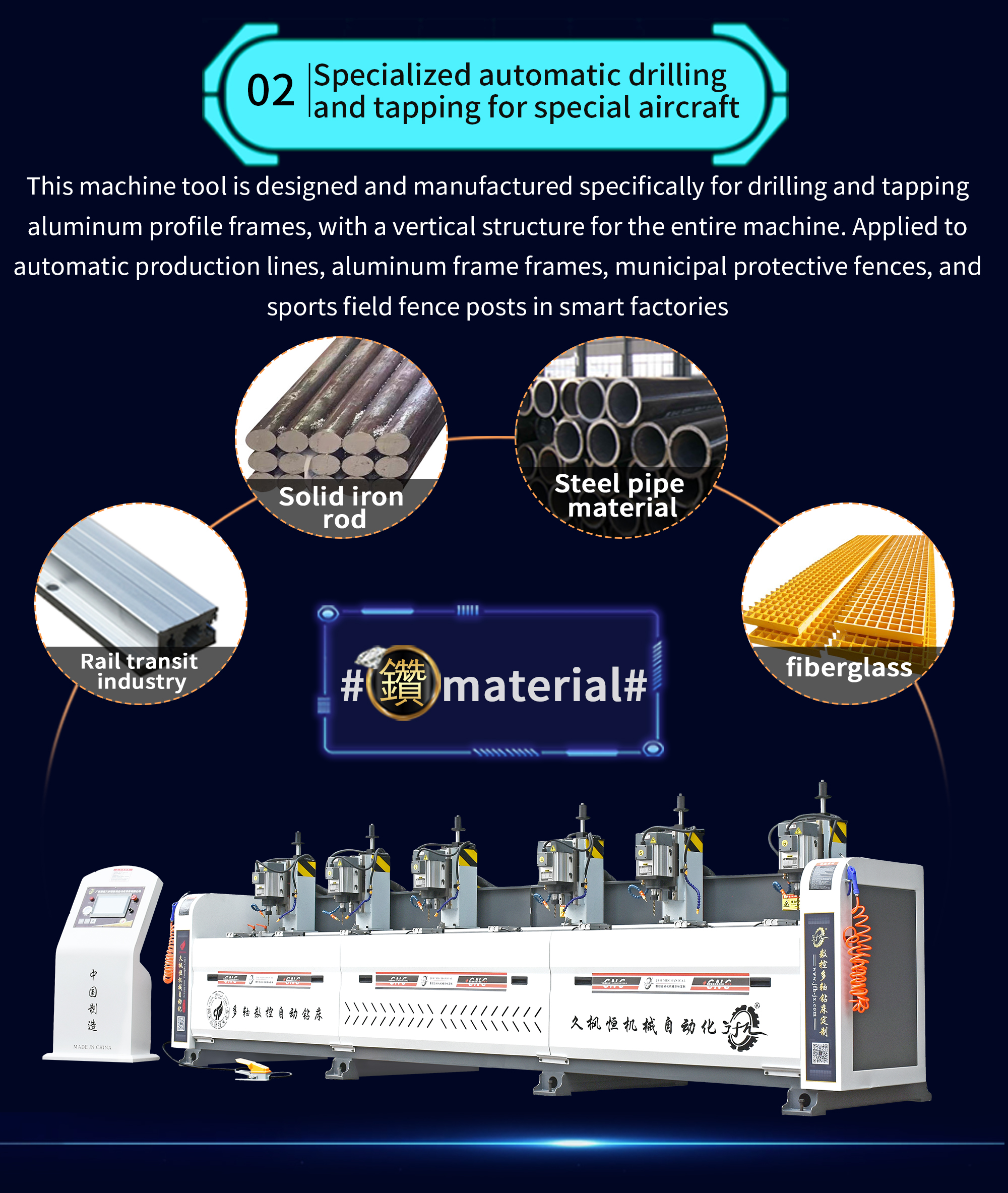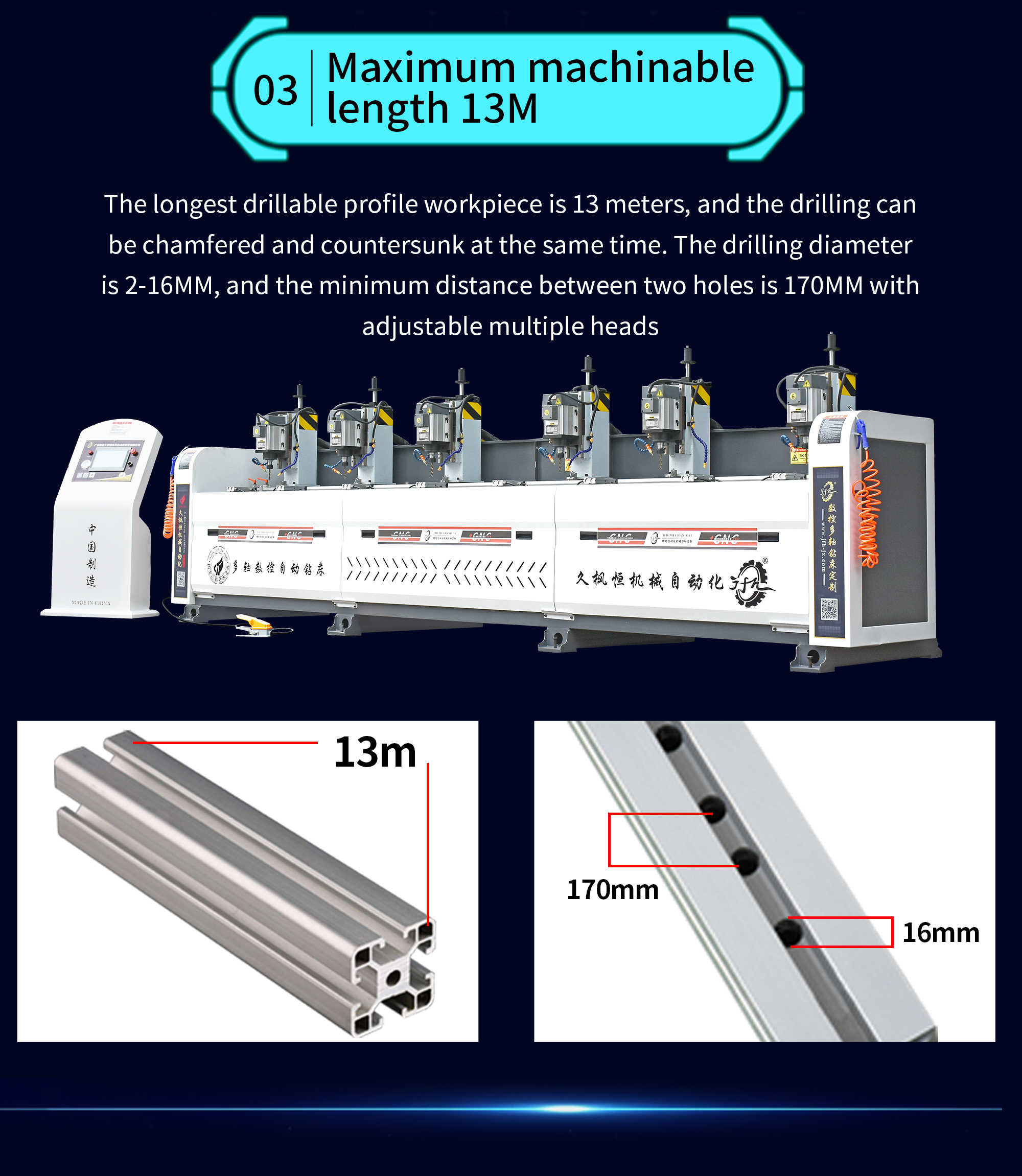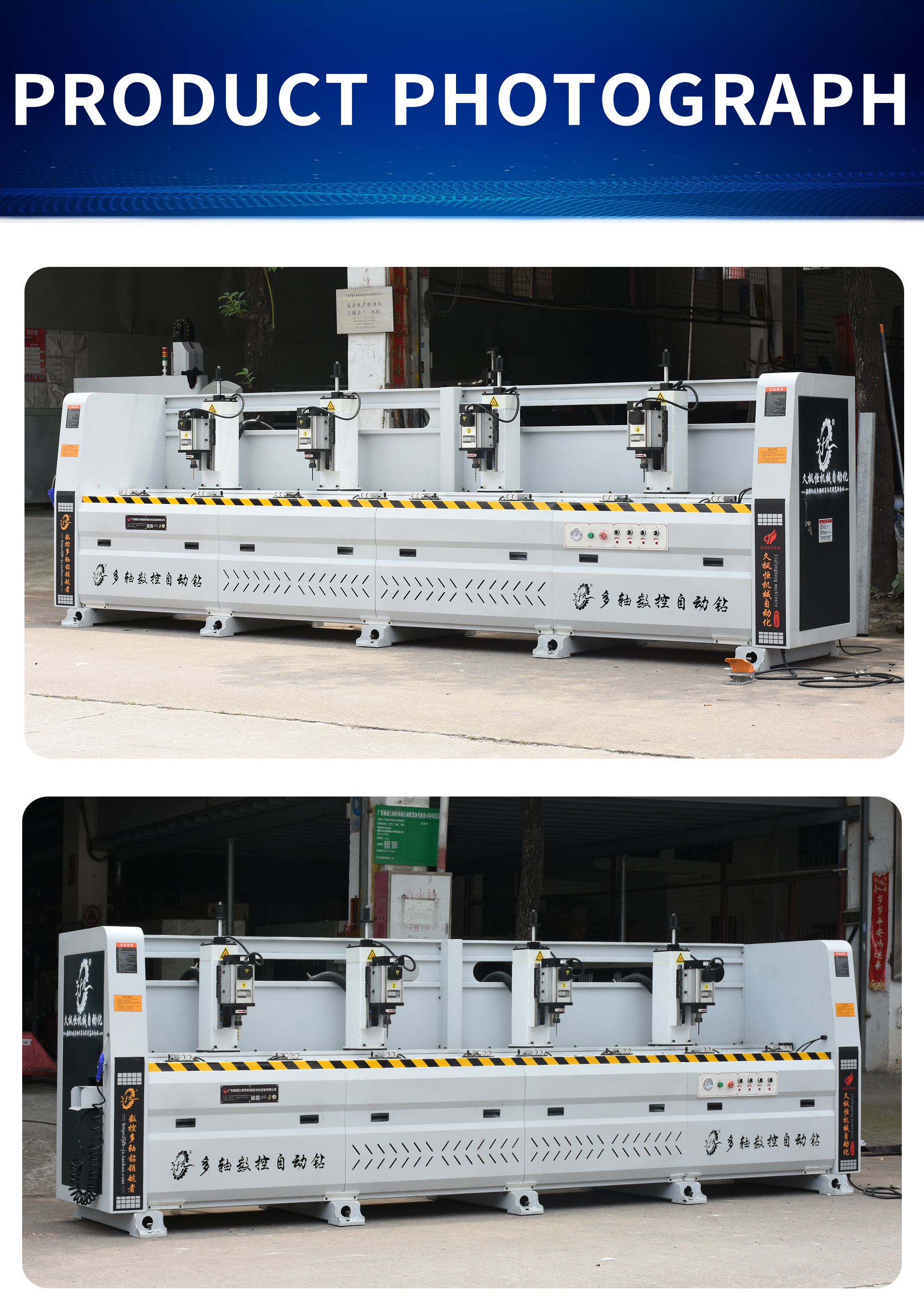 The multi head automatic drilling machine JFH-JX-T06-L4500 is widely used for automatic drilling in various industries such as industrial automation production lines, solar new energy, bridge frames, furniture aluminum alloy profiles, all aluminum home furnishings, automotive parts, aviation manufacturing, building construction, aluminum doors and windows industry, mechanical equipment, etc.